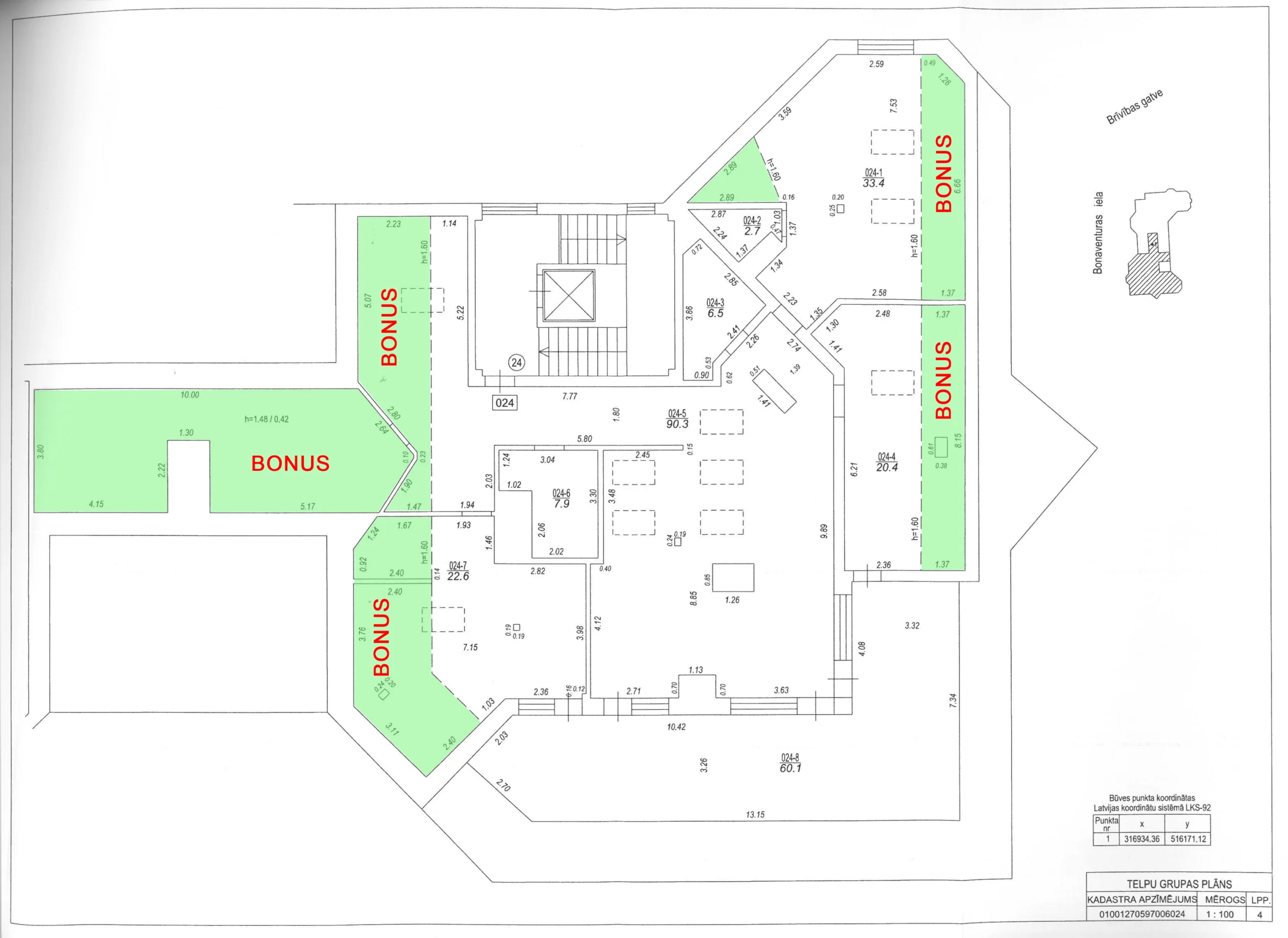 Dzīvokļa kopējā platība ir 244 m2, kurā ietilpst terase (60 m2), kā arī bonusā nāk papildu kvadratūra kas neietilpst dzīvokļa kopējā plātība un par kuru netiek aprēķināta apsaimniekošanas maksa – mansarda jumta slīpumi (58 m2) un noliktavas telpa (39 m2). Visa dzīvokļa platība atrodas vienā līmenī, bez kāpnēm.