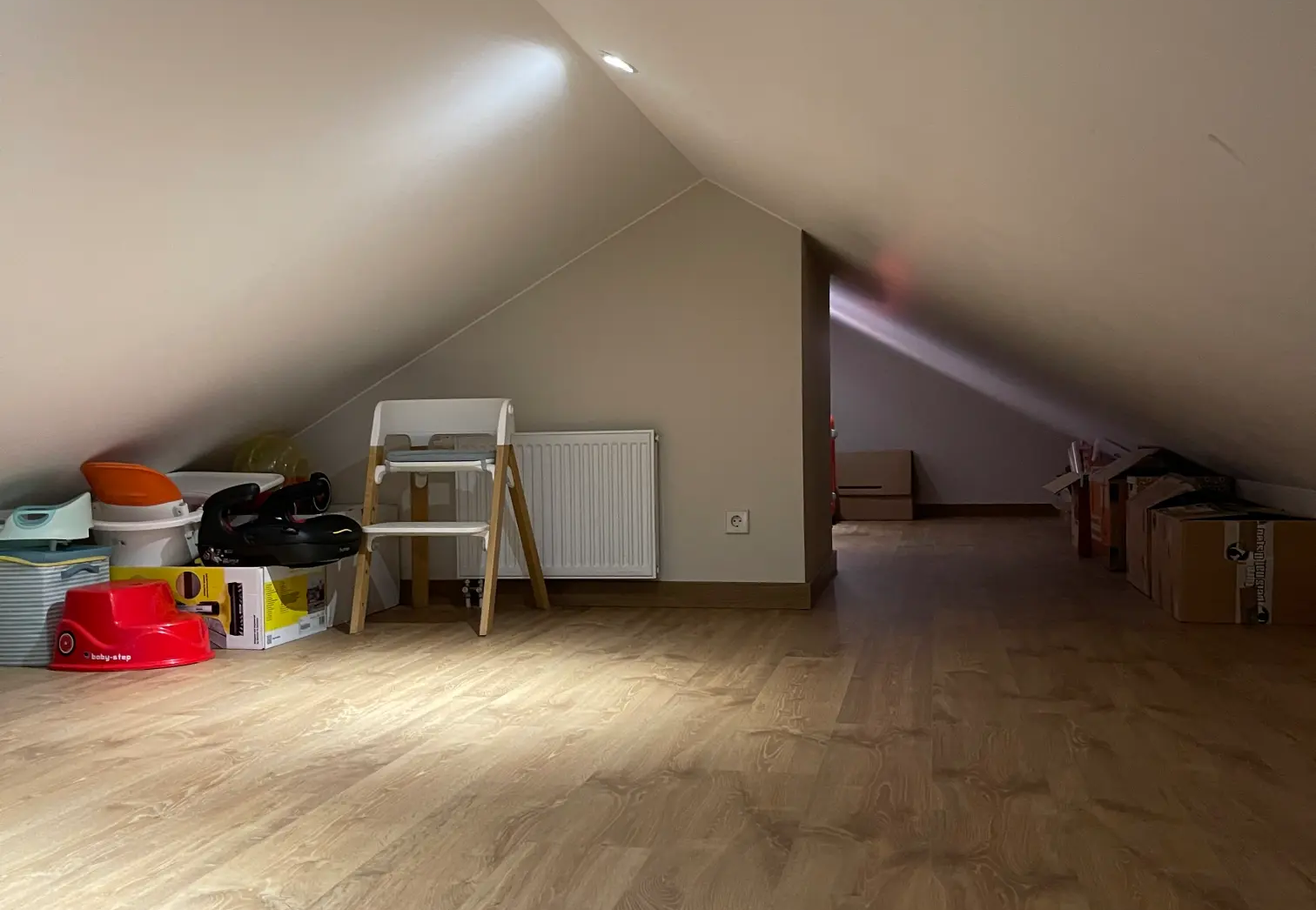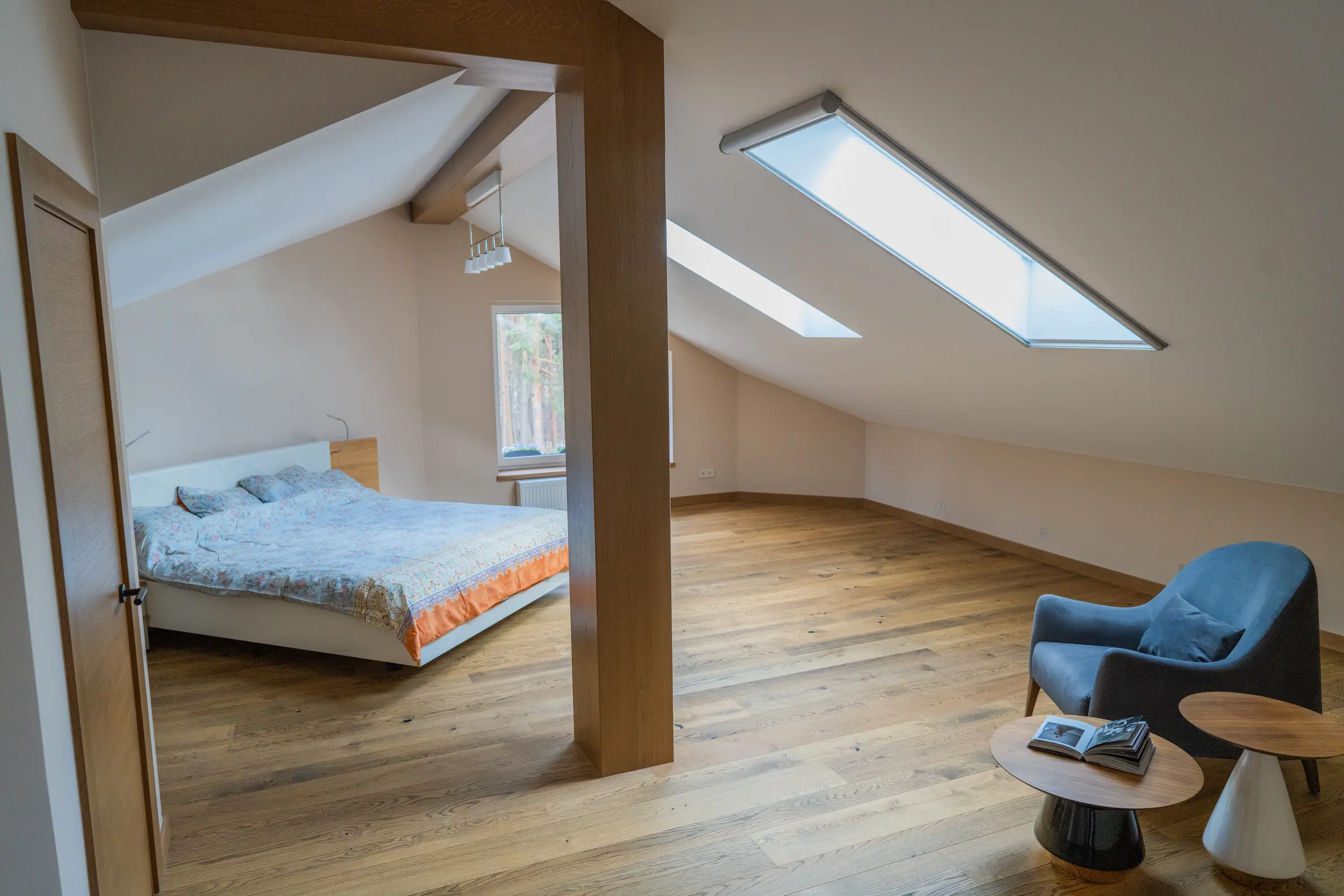 Die Gesamtfläche der Wohnung beträgt 244 m², einschließlich der Terrasse (60 m²). Als Bonus erhalten Sie zusätzliche Fläche, die nicht zur Gesamtfläche der Wohnung gehört und für die keine Wartungsgebühr erhoben wird — Dachschrägen (58 m²) und Abstellraum (39 m²). Die gesamte Fläche der Wohnung befindet sich auf einer Ebene, ohne Treppen.