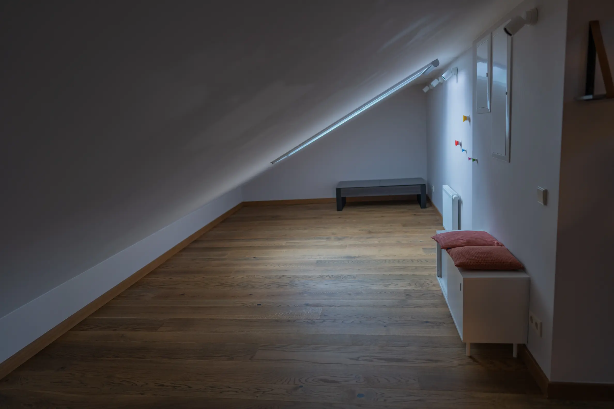 Die Beleuchtung von spanischen und italienischen Marken wurde im Salon GAISMAS MAGIJA erworben. Die gesamte Küchenzone und die Bartheke sind mit LED-Beleuchtung ausgestattet, die abends eine angenehme Atmosphäre schafft und auch als hervorragende Nachtbeleuchtung dient. In beiden Schlafzimmern und im Korridor ist ebenfalls eine in den Boden integrierte LED-Beleuchtung installiert. Farbe und Intensität sind regulierbar.