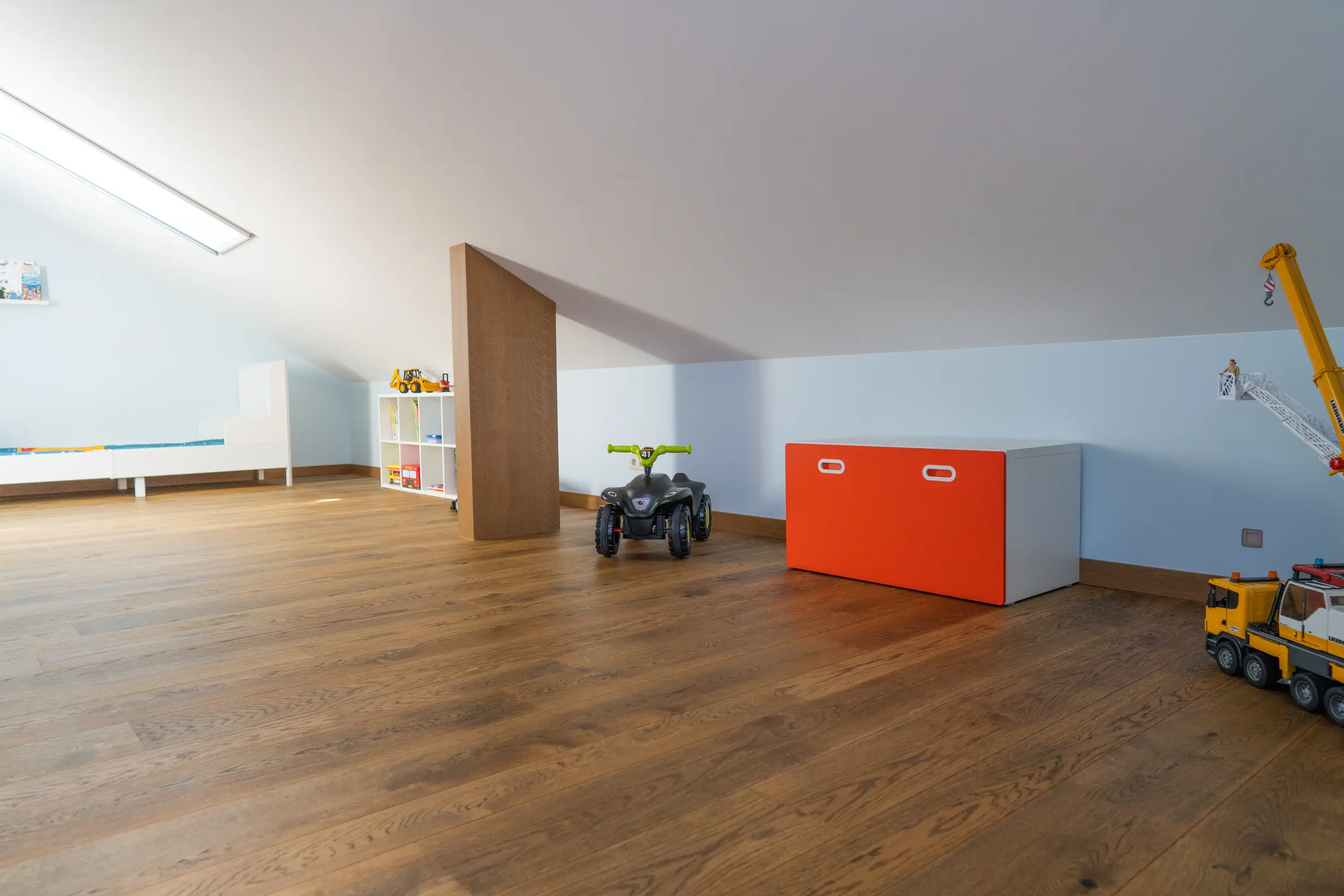Dreischichtiger, hochwertiger Eichenparkettboden vom Hersteller BOEN mit zusätzlicher Wärme- und Schalldämmung.